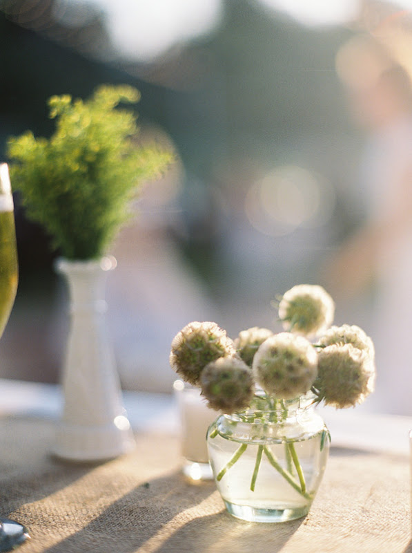 for the dining tables, the bride provided a burlap runner that we set with varying size/shape bottles and vases - we used a mixture of milkglass, blue glass and clear glass and filled them with one type of yellow or white theme flower - queen anne's lace, billy balls, scabiosa pods, soladaster, fever few, china mums, lisianthus, etc. we also added some rustic brown dried pods that each held a cream balsa wood flower...